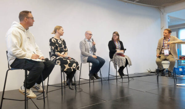 Pääkuva: Juha Lehtonen keskusteli symposiumin tauolla Mikko Puumalan (vas.), Manna Ahon ja Vesa Ollilaisen kanssa.
